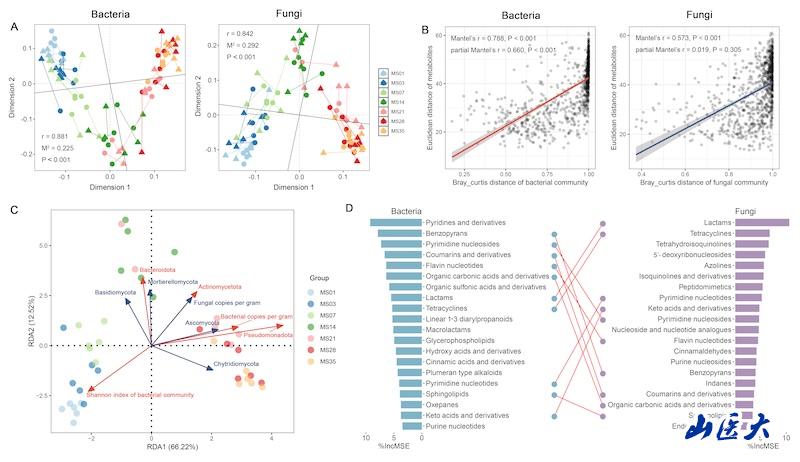 團(tuán)隊(duì)還基于非靶向代謝組技術(shù)研究了尸體腐敗過程中的代謝物組成,并與微生物組構(gòu)建關(guān)聯(lián)。結(jié)果顯示,細(xì)菌群落對(duì)代謝物的解釋度高于真菌群落,表明細(xì)菌群落在尸體腐敗過程中的主導(dǎo)地位。共現(xiàn)網(wǎng)絡(luò)分析表明,細(xì)菌和真菌在尸體腐敗代謝過程中既有其獨(dú)特的生態(tài)位,又存在廣泛的跨界合作。最后,研究比較了不同組學(xué)在預(yù)測(cè)死亡時(shí)間方面的性能,結(jié)果表明代謝組預(yù)測(cè)最為精準(zhǔn),絕對(duì)定量技術(shù)在預(yù)測(cè)死亡時(shí)間方面無明顯優(yōu)勢(shì)。因此,在預(yù)測(cè)死亡時(shí)間時(shí)推薦采用價(jià)格更為低廉的相對(duì)豐度測(cè)序(RMP)。該成果為深入理解尸體的微生物分解機(jī)制提供了新的更全面的視角。