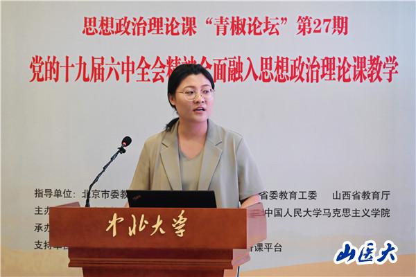 為了更好地推動(dòng)學(xué)習(xí)貫徹黨的十九屆六中全會(huì)精神工作不斷往深里走、往實(shí)里走、往心里走,引導(dǎo)廣大思政課教師將黨的十九屆六中全會(huì)精神科學(xué)準(zhǔn)確地融入思政課教學(xué)活動(dòng)全過程,7月27日,第27期全國(guó)思想政治理論課“青椒論壇”在中北大學(xué)舉行,來自北京、山西的六位優(yōu)秀青年教師和兩位名師,圍繞“黨的十九屆六中全會(huì)精神全面融入思想政治理論課教學(xué)”進(jìn)行了教學(xué)展示和名師分享。馬克思主義學(xué)院院長(zhǎng)蘇果云教授和青年教師孫英博士參加了此次論壇。