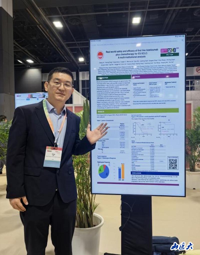 近日,由我校附屬第二醫(yī)院腫瘤科牽頭,聯(lián)合山西白求恩醫(yī)院、太鋼總醫(yī)院、晉中市第三人民醫(yī)院、晉城大醫(yī)院等多家醫(yī)療中心,基于真實世界數(shù)據(jù)開展的“替雷利珠單抗聯(lián)合化療一線治療廣泛期小細胞肺癌的療效與安全性”及“尼達尼布用于預防不可切除非小細胞肺癌放射性肺炎的一項前瞻性、多中心Ⅱ期研究”兩項研究成功入選2025年歐洲腫瘤內科學會亞洲年會(ESMO Asia),以壁報形式展出于2025 ESMO Asia新加坡會場。
