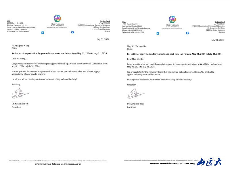 近日,我校公共衛生學院王慶堯和賀芷璇兩位同學圓滿完成世界比較教育學會(World Curriculum By Comparative Education Societies)為期3個月的線上實習項目并獲得實習證書。