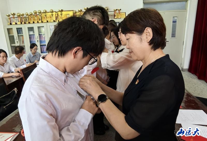 會議在莊嚴的國歌聲中拉開序幕,隨后,與會老師為全體畢業(yè)生黨員佩戴黨員黨徽、贈送《中國共產(chǎn)黨章程》 。畢業(yè)生黨員代表王燦、趙子豪分別作了情感真摯的發(fā)言,感恩母校的悉心栽培和老師們的諄諄教誨,表示在今后的工作學習生活中將始終秉持“醫(yī)理博精 德能高邃”的校訓,在學思踐悟中堅定理想信念,在奮發(fā)有為中踐行初心使命,為中國式現(xiàn)代化建設貢獻青春力量。