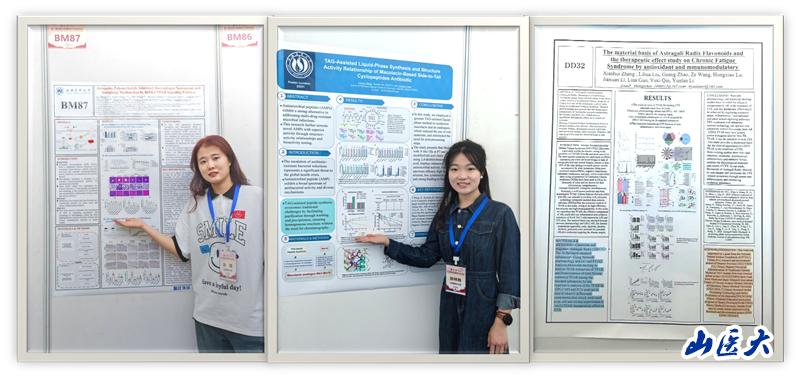在此次會議中,我校藥學院碩士研究生張璐和張林艷同學在梁泰剛教授的指導下,博士研究生張曉慧同學在李云蘭教授的指導下,制作了墻報進行展示和交流。在墻報交流環節,張璐同學對“Astragalus Polysaccharide Inhibited Macrophages Necroptosis and Autophagy Dysfunction by RIPK1/TFEB Signaling Pathway”進行重點闡述,其中巨噬細胞程序性壞死和自噬功能障礙與多種疾病的發生發展密切相關,黃芪多糖的抑制作用為相關疾病的治療提供了新的靶點和思路。張林艷同學對“TAG-Assisted Liquid-Phase Synthesis and Structure Activity Relationship of Macolacin-Based Side-to-Tail Cyclopeptides Antibiotic”進行了詳細匯報,以最新發現的抗生素馬可拉星為研究對象,通過標簽輔助多肽合成方法,全合成了具有抗菌活性的脂環肽及15個的類似物,并系統研究其抗菌構效關系(SAR),為新型環肽類抗菌藥物的開發提供了基礎。張曉慧同學以“The material basis of Astragali Radix Flavonoids and the therapeutic effect study on Chronic Fatigue Syndrome by antioxidant and immunomodulatory”為題進行交流,主要涉及超聲波輔助低共熔溶劑提取的黃芪黃酮類化合物通過抗炎抗氧化作用抵抗慢性疲勞綜合征。